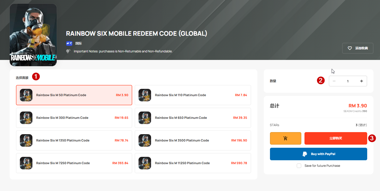 第 2 步:选择您需要的白金兑换码,输入数量并点击“立即购买”继续。