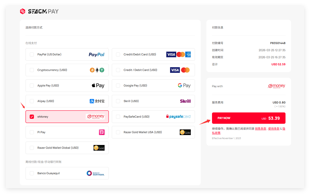 步骤 2: 选择eMoney 并点击“立即支付”(Pay Now)。