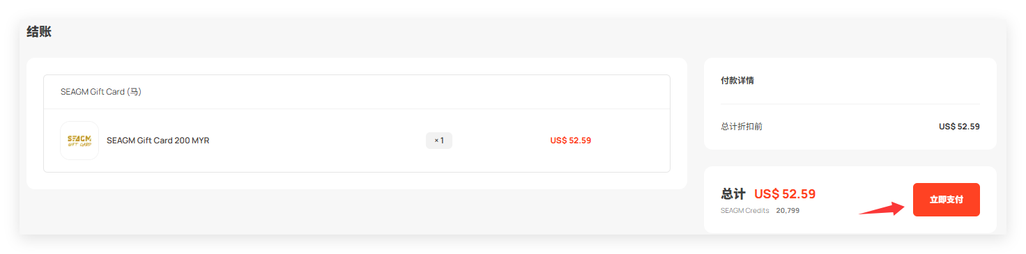 步骤 1: 在 SEAGM 选择你想购买的商品,然后点击“立即支付”(PayNow),进入结算页面。