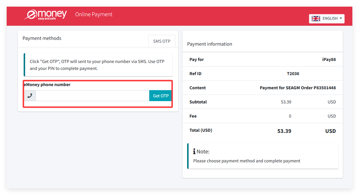 重要说明:eMoney [美元] 支付方式仅适用于柬埔寨用户,并且仅支持美元(USD)支付。
