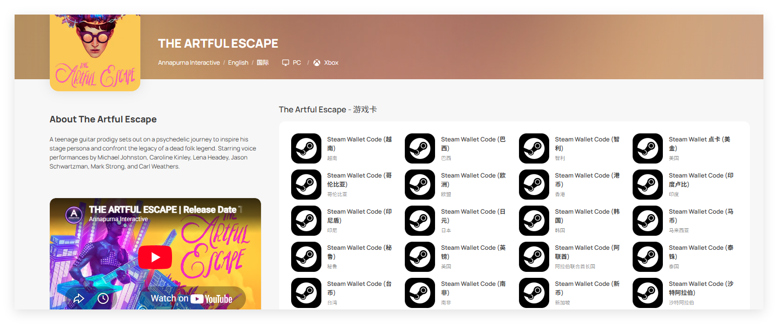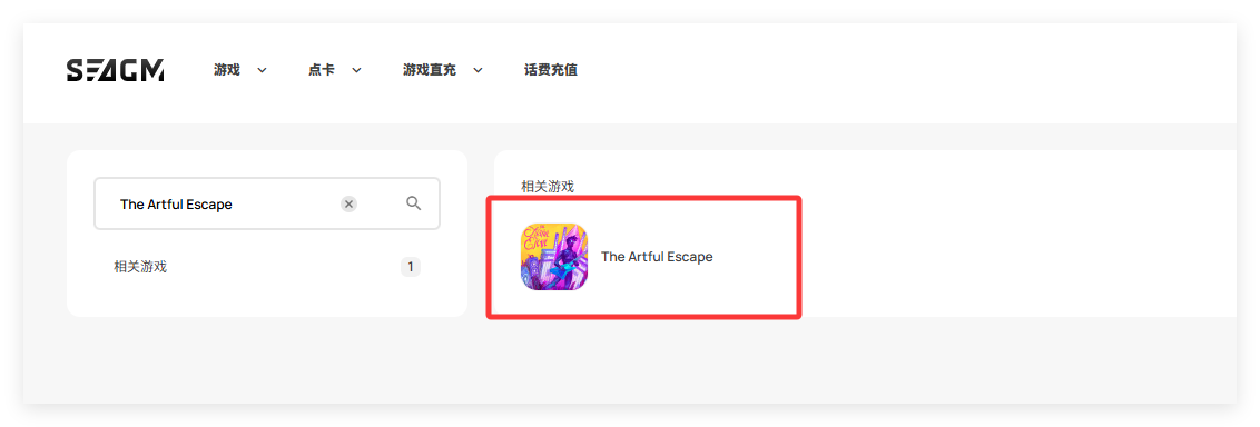 第 1 步:登录/注册 SEAGM 帐户。 在顶部菜单中输入关键字"Artful”并搜索。 选择"The Artful Escape"。