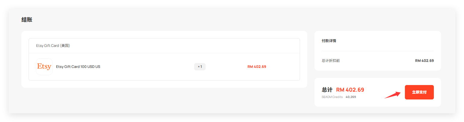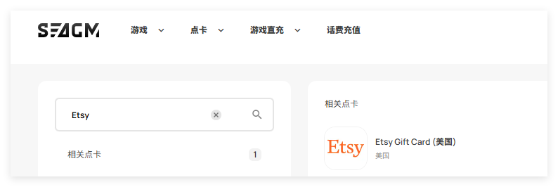 第 1 步:登录/注册SEAGM帐户。 在顶部菜单中输入关键字“Etsy”并搜索。 选择“Etsy 礼品卡【美国】"。