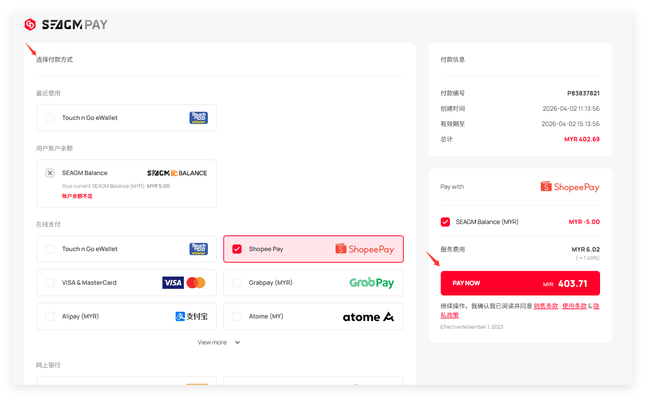 第 4 步:选择您需要的付款方式,点击“Pay Now”即可完成付款。