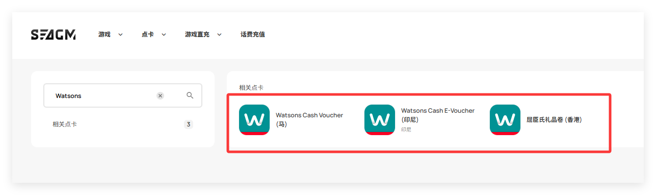第 1 步:登录/注册SEAGM帐户。 在顶部菜单中输入关键字“Watsons”并搜索。 选择“Watsons 礼品卡【根据您的地区】"。