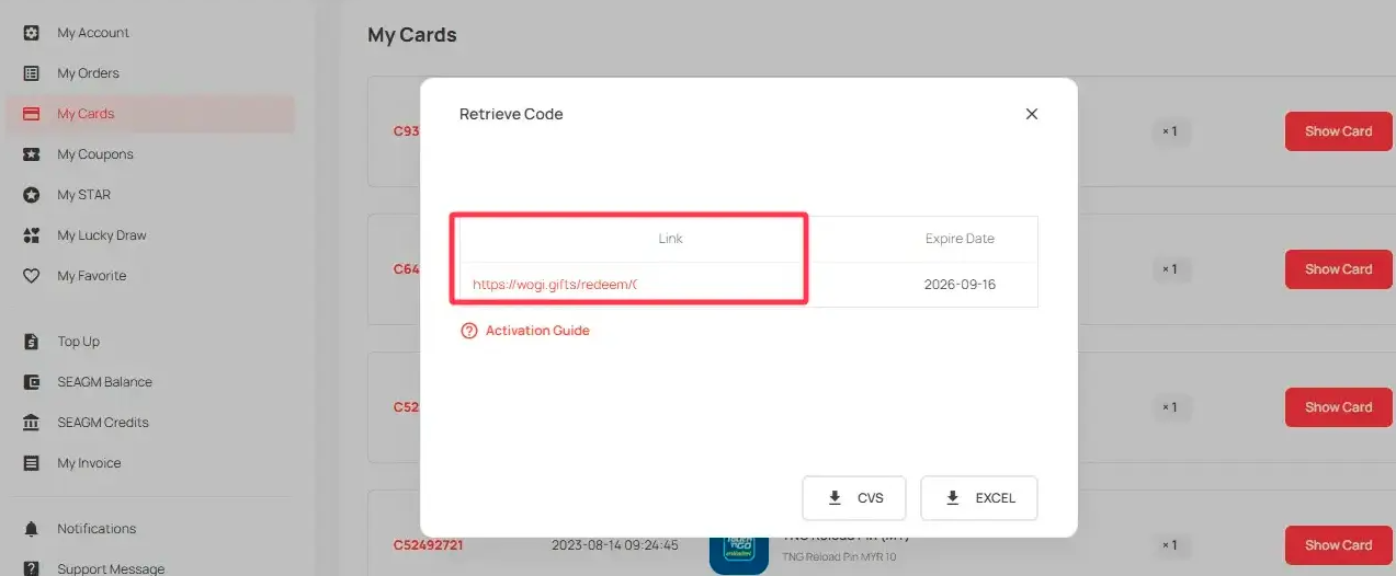 步骤1: 在SEAGM完成购买后,请前往“我的卡密”中获取你的游戏卡代码。