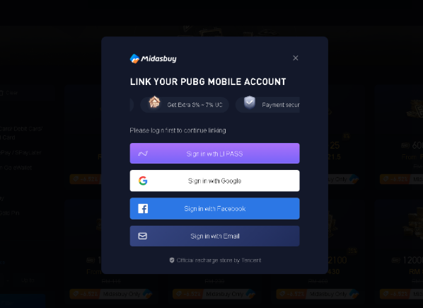 - 您的PUBG帐户必须与Midasbuy 帐户电子邮件关联。