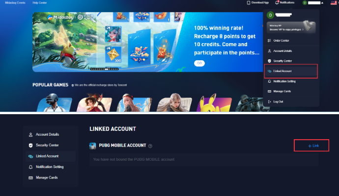 [2] 登录Midasbuy帐户,然后单击页面右上角的您的名字。然后,单击[Linked Account]。