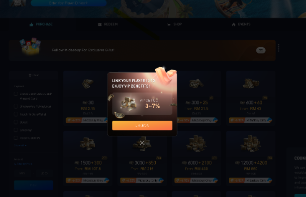 [1] 在Midasbuy网站上,您将看到弹出[Link now]消息。点击并选择您的登录/注册方法。