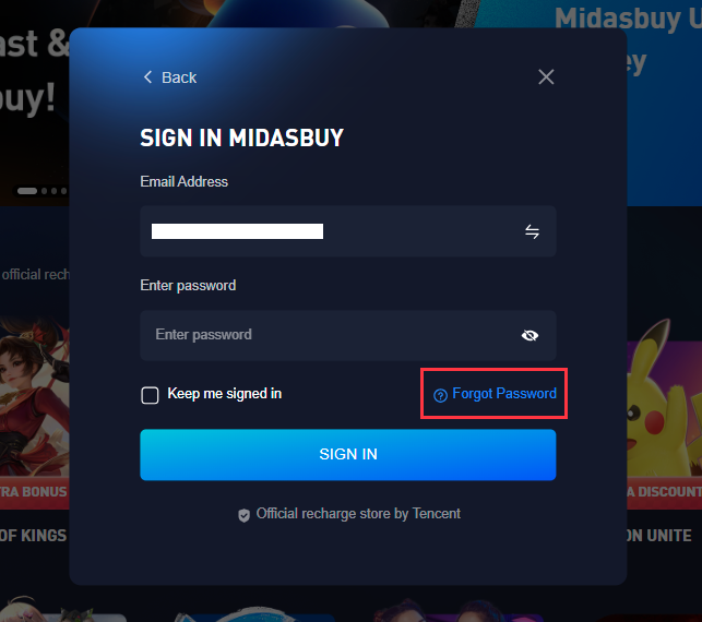 [i] 如果您通过电子邮件注册了Midasbuy帐户,但忘记了登录密码,您可以尝试通过点击[忘记密码/Forget Password]选项重置密码。